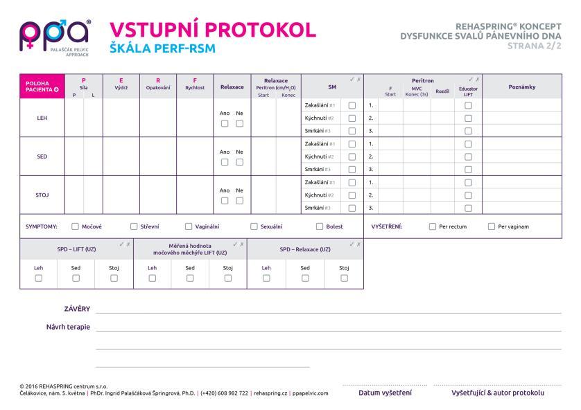 - vyšetření per vaginam (přes pochvu) ‑ palpační vyšetření ke zhodnocení stavu svalů pánevního dna, schopnost aktivace i relaxace svalů pánevního dna, nutné aby klientka v době vyšetření nemenstruovala